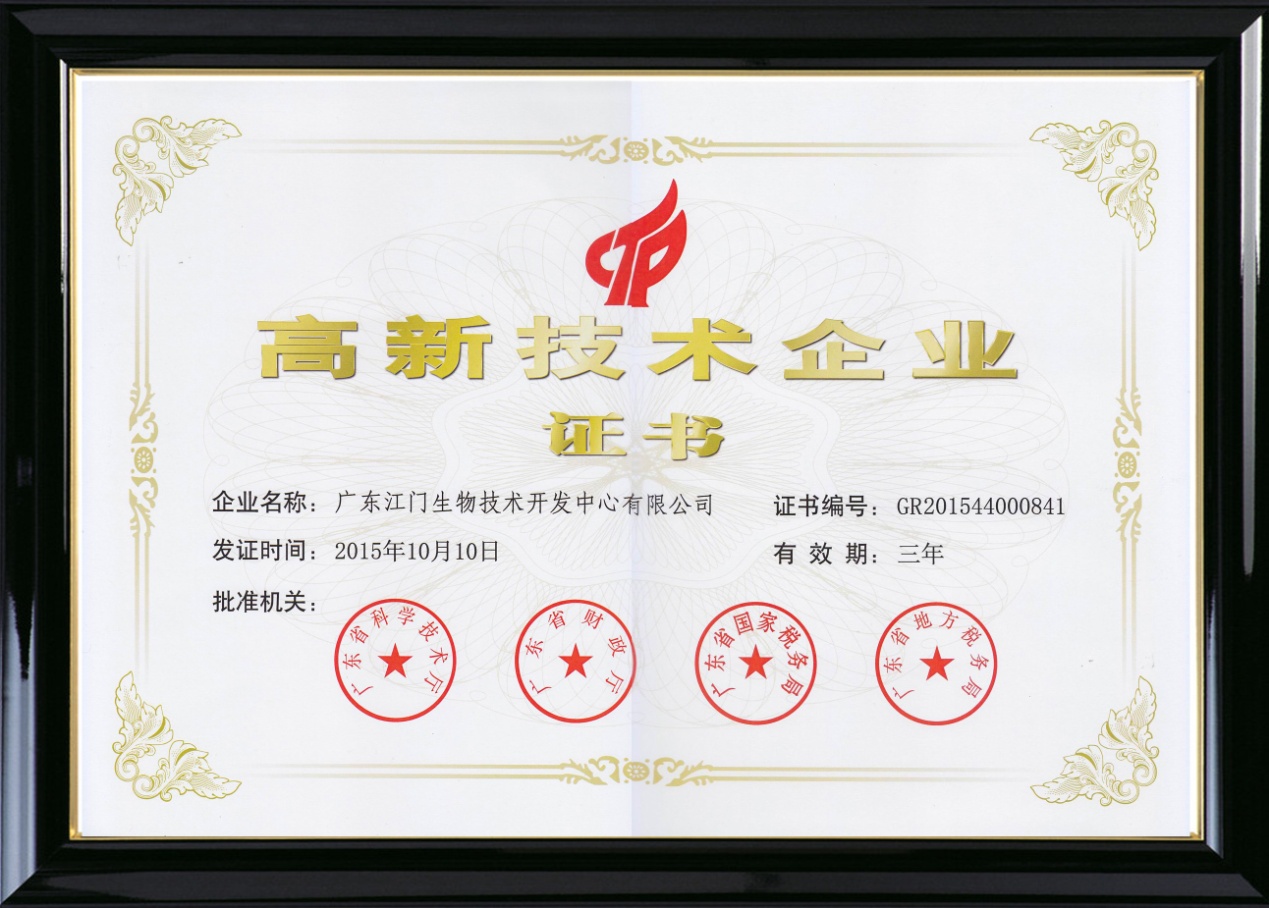 2016年3月21日生物中心收到廣東省科學技術廳、廣東省財政廳、廣東省國家稅務局、廣東省地方稅務局聯合頒發的《高新技術企業證書》,再次被認定為國家高新技術企業。這是自2009年以來,生物中心連續多次獲得國家高新技術企業認定。